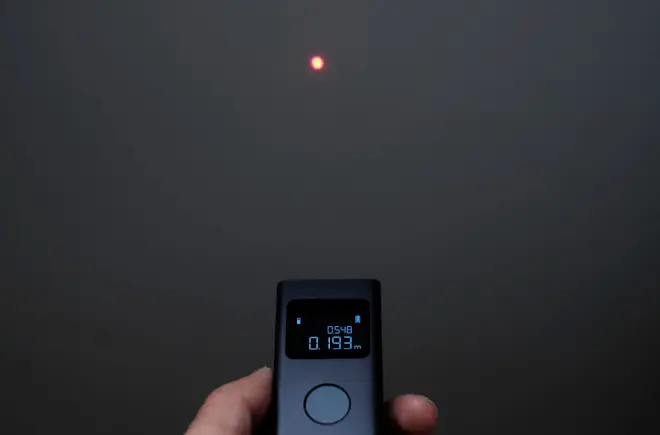 开机后,我们便可以看见机器发出的红外光线,只需将光线对准需要测量的物体,它就会自动计算出之间的距离,非常的快速准确。