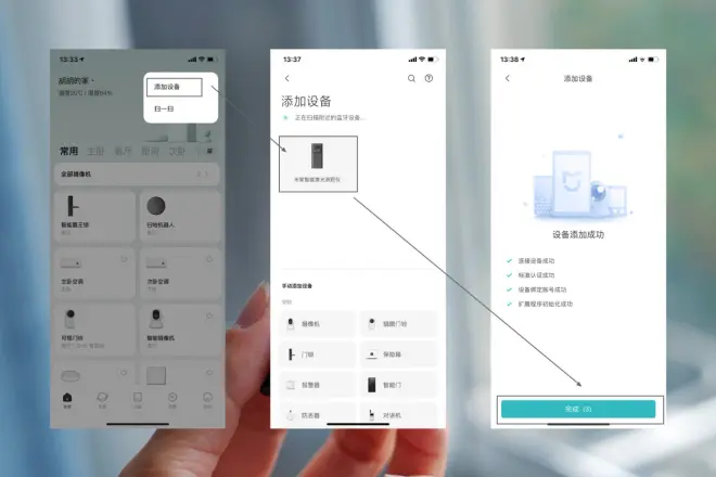 如果单单是这点还谈不上测量神器,接下来才是它最厉害的地方。拿出手机,打开米家APP,点击右上角添加,就可以自动搜索到米家测距仪,按照提示即可完成智能连接。
