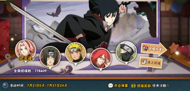 详情: 宇智波佐助7月23日生日快乐! 每天有2次任务次数,次数可累积但最多能获得5次任务次数(点击忍者头像就有任务) 提交五种活动道具(蛋糕、薯片、礼花、鲜花、礼物)给宇智波佐助可加速全区祝福数量(基本都能领取,你要相信百万白绝的力量hhh~)