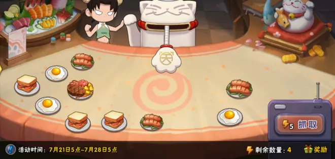 详情: 通过消耗“元气能量”,控制机器猫伸出猫爪,抓取餐桌上各类美味的食物餐盘。餐盘成功抓取后,可获得相应类型的食物道具,用于奖励商店进行资源兑换(优先保护符、饰品等) 只要进行抓取操作便会消耗5点元气能量( 无论是否勾中),餐桌上的餐盘全部抓取完毕后,将会刷新出新的餐盘。不同大小的餐盘,所对应的食物道具数量 也有所不同(大份=3个、中份=2个、小份=1 个)。