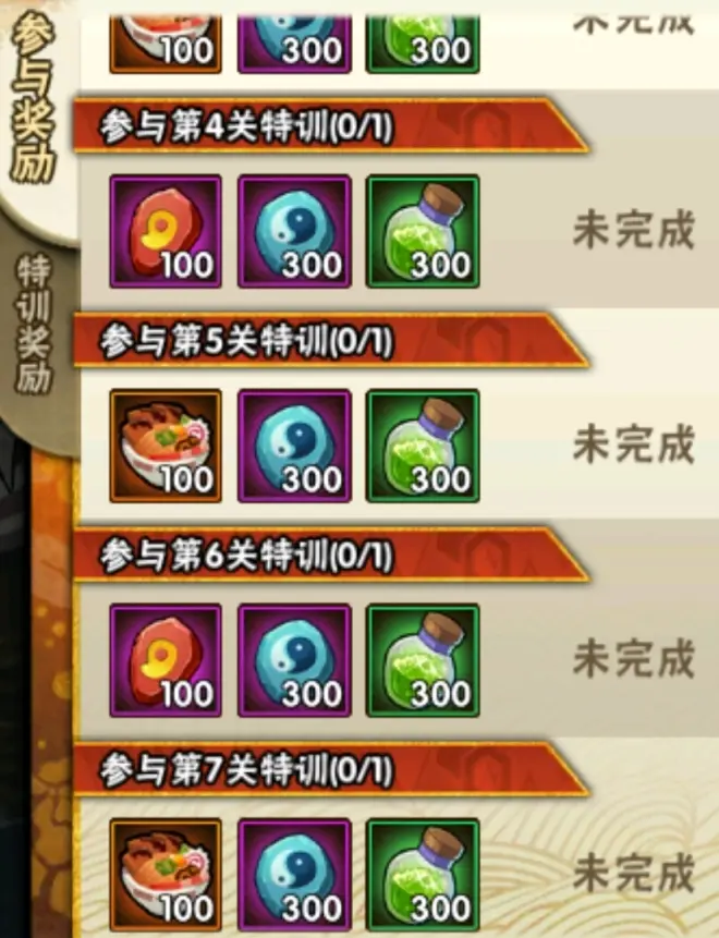 详情: 自来也老师特训小课堂一共分为七个关卡,按照时间逐步开放新的关卡(比之前容易多了,先看题目会告知靠什么内容) 每一关特训包含不同数量题目,参与特训就能获得参与奖励,答对一题解锁下一关特训,答对全部题目获得所有特训奖励。