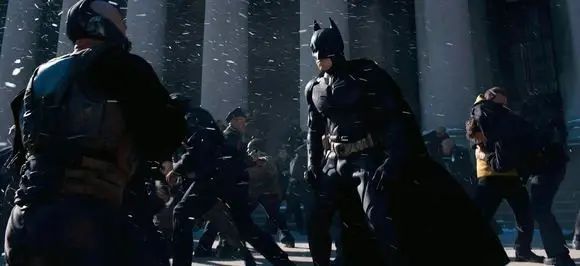 片尾的大混战,缺乏装备的警察走上街头,准备决死一拼。然后蝙蝠侠突然出现破坏了装甲车,警察们看到了这座城市的希望之光,大受鼓舞集体冲锋与佣兵们肉搏。三部曲里第一次出来了蝙蝠侠在白天现身的剧情,他不再是个那个躲在黑暗中的义务警员,这座城市的警察也不再是给他添乱的拖油瓶,他们真正地在一起,为这座城市,也在自己和家人的生存而战斗。(这里对应了第二部所提出的光明骑士的概念,真正能鼓舞人心的存在)