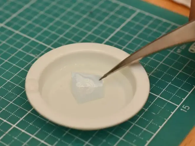 剪完水贴后,用镊子将水贴浸泡在水中十秒钟,观察整张水贴纸被浸润。