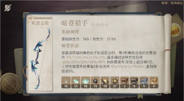 暗巷系列的弓系武器,非常适合后台副C佩戴。而弓系角色中,副C和辅助角色偏多,该武器的角色灵活度因此偏强。精炼提升中上。适合角色: