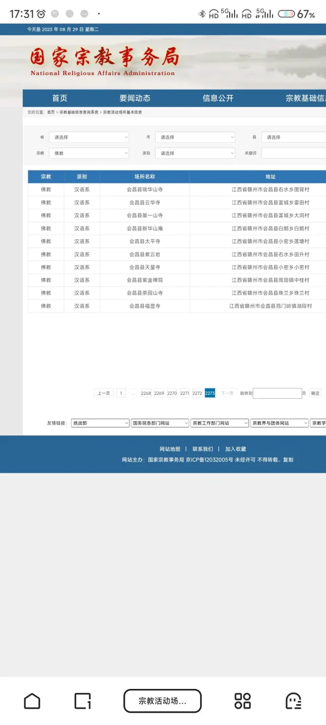 道教注册活动场所 一页十五个,最后一页九个,15x556=8340再加是最后一页9个等于8349个。