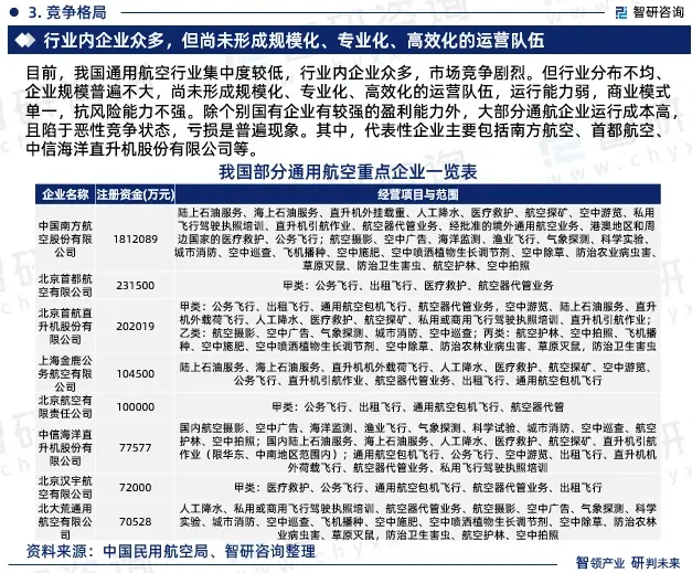 目前,我国通用航空行业集中度较低,行业内企业众多,市场竞争剧烈。但行业分布不均、企业规模普遍不大,尚未形成规模化、专业化、高效化的运营队伍,运行能力弱,商业模式单一,抗风险能力不强。除个别国有企业有较强的盈利能力外,大部分通航企业运行成本高,且陷于恶性竞争状态,亏损是普遍现象。其中,代表性企业主要包括南方航空、首都航空、中信海洋直升机股份有限公司等。