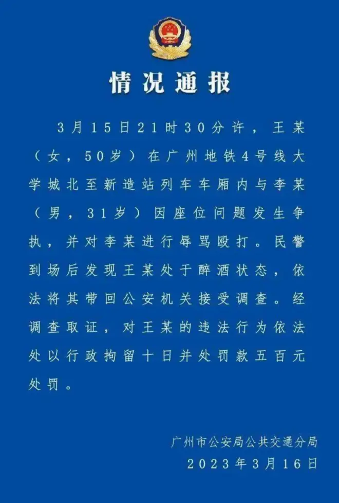 3月15日,广州地铁线上一名女子(50岁)与一男子(31岁)因座位产生口角后,女子对男子进行了殴打,不仅猛击该男子头部,还对其进行辱骂。