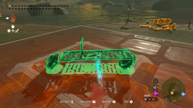 这个飞行器经过仔细的调教,可以比较粗略地脱手直飞,但是仍然有一个奇怪的飞行特征。当我将操纵杆右打,让飞行器右转几秒,然后再回正取消输入,此时飞行器姿态会自动地过度回正到左倾(滚转意义上的左倾),并且会不受控制地继续左倾下去直到把林克甩下来。同样地,如果我先左打再回正,飞行器也会姿态过度回正到右倾,并且一直右倾直到把林克甩下来。这两种缓慢失控状态可以用操纵杆左右输入自由切换,只要林克还没被甩下来。