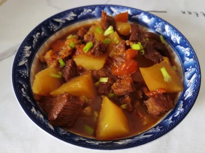 其次,西红柿是这道菜的另一个重要成分。它富含维生素C、胡萝卜素等营养成分,具有抗氧化、增强免疫力等作用。同时,西红柿还能为这道菜增添酸甜的口感,与牛腩肉的鲜美味道相得益彰。 最后,土豆也是这道菜的重要成分之一。它富含碳水化合物、膳食纤维等营养成分,有助于提供能量、促进肠胃蠕动。同时,土豆的绵软口感也为这道菜增加了一份醇厚的感觉。 除了这些主要成分,还可以根据个人口味和喜好添加一些其他的调料和配菜,如草果、花椒等香料,或是洋葱、胡萝卜等蔬菜,这些配料都能为这道菜增添更多的层次感和口感。