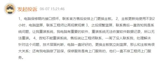 这位用户遇到的情况是这样的。首先是电脑保修期内接口损坏,联系官方售后安排了上门更换主板。主板更换不到2小时开始出现电脑蓝屏情况,工程师让用户再观察观察。因为随后依然出现频繁蓝屏,售后判断为系统问题,让用户重装系统。用户有重要软件不能重装系统,告知售后后,售后表示会有工程师进行联系,结果一周用户也没有等到消息。