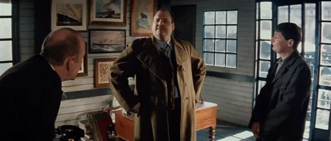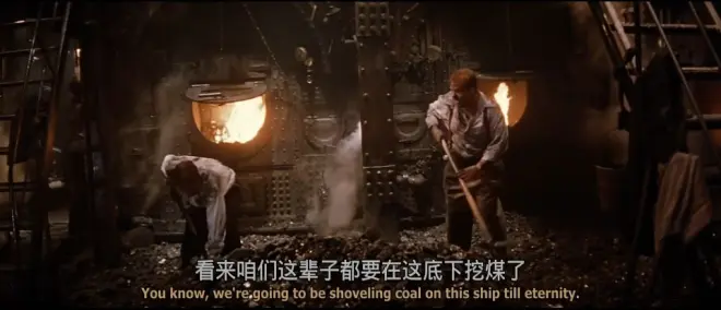 1.全景定场镜头,交代时间、地点、环境。导演从一开始就给观众建立心理预期,邮轮左低右高,之后镜头切到内景也是左低右高。