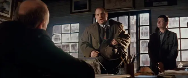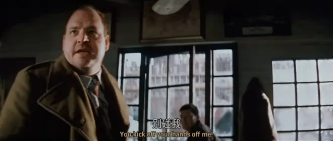 5.防守者固执己见,然后拍案而起,起身的动作带动镜头从俯视变为仰视,增强压迫感。