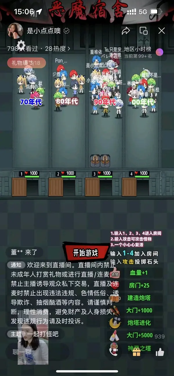 【玩法介绍】 恐怖夜晚降临,宿舍门外有怪物徘徊不去,疯狂攻击大门!所有的玩家需要躲在房间内,升级大门血量,建造炮塔,不断点赞给房门回血,来抵御怪物!大门被攻破了怪物将会把所有玩家吃掉!
