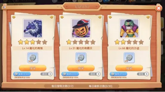 家族任务里,族长可以消耗家族资金刷高星级通缉怪物任务,成员接受任务后,可以获取更多的银币。