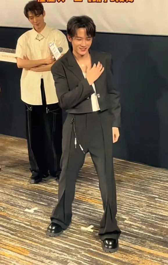 张晚意穿的是灰色西装搭配黑色西裤,现代装与古装一样,还是一如既往地帅气。檀健次身穿黑色休闲西装,这件上衣还是短款,一眼看去,有点像女装。
