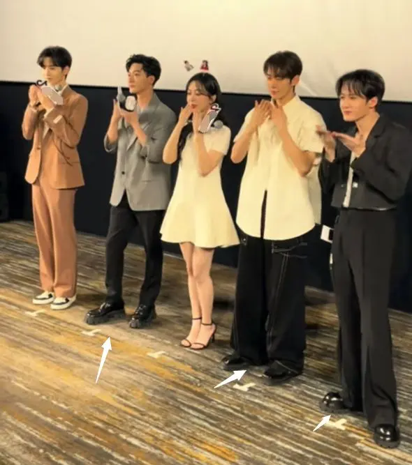 除了檀健次外,邓为、张晚意穿的也是同样的皮鞋,网友吐槽,他们的鞋子都是批发的吗?反而是一旁的王宏毅,穿了一双板鞋,而且个子比其他三人还高。
