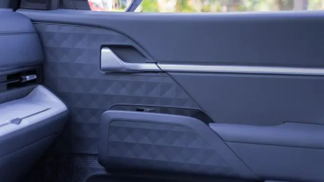 首先在设计上,沐飒就在这三个功能区上做了划分,比如主驾驶座椅和副驾驶座椅皮料颜色是不一致的(当然也可以选择一样颜色的皮料),此外,主驾驶门板、副驾驶门板和后排座椅门板采用了不一样的塑料花纹,在视觉上形成了三个较为独立的功能区,也加深了“两室一厅”的概念。
