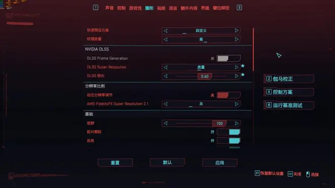 使用目前比较火热的3A大作《赛博朋克2077》对比DLSS功能下的画质和帧数区别。