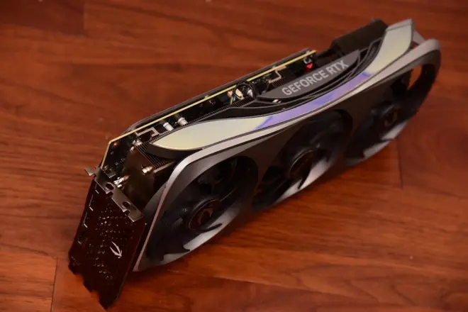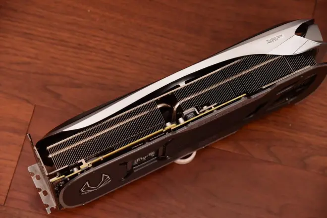 显卡的散热器为均热板和热管相结合的形式,5根直径6MM散热鳍片充斥着整个显卡内部。