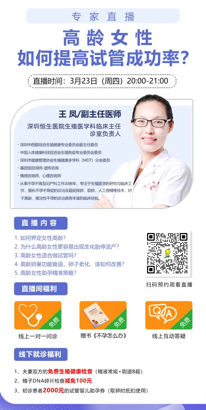 3月23日(周四)晚8点,shawkea特邀深圳恒生医院生殖医学科临床主任王凤医师,为大家讲解《高龄女性,如何提高试管成功率?》