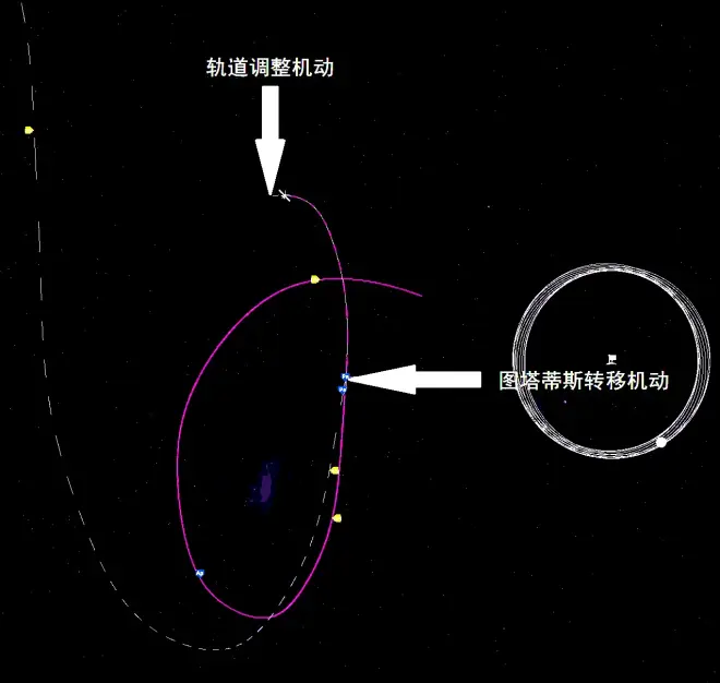 2012年4月15日,在日地L2点环绕了1.5圈后,一次速度增量为6.44m/s的轨道调整机动使得嫦娥二号进入了一条近似L2环绕轨道。如上图粉线所示,若接下来不执行任何机动,嫦娥二号将脱离L2点环绕轨道。2012年5月31日,嫦娥二号执行第二次轨道机动,速度增量为105.13m/s,随后向北脱离轨道平面,飞向图塔蒂斯小行星。