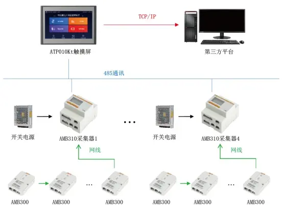 此母线槽红外测温解决方案由人机HMI触摸屏,红外测温模块,红外采集器,电源模块组成。该系统通过RS485线与本地触摸屏进行通信,再有触摸屏上传数据至第三方平台(如下图),系统设计遵循国际标准Modbus-RTU传输规约,安全性、可靠性和开放性都得到了很大地提高。RS-485作为一种串行通信的接口具有传输距离长、速度较高、电平兼容性好、使用灵活方便、成本低廉和可靠度高等特点,与无线通信方式相比,具有价格低、抗共模干扰能力强等优点。