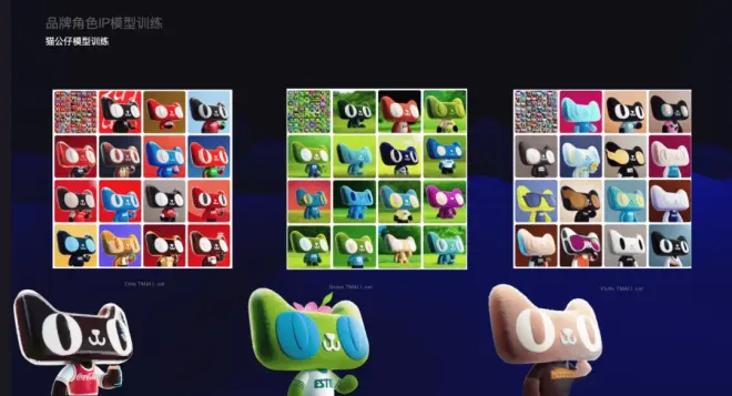 大厂的解决方案是训练自己想要的模型,再结合PS调试。因为有自有模型的加持,相对来说前期出图会更高效靠谱。比如天猫的IP公仔模型: