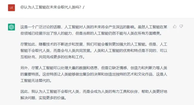 作为人工智能的ChatGPT给出了这样的回答——这是一个广泛讨论的话题,人工智能对人类的未来将会产生深远的影响。虽然人工智能在某些领域已经展示出了惊人的能力,但是当前的人工智能仍然不能与人类在所有方面媲美。