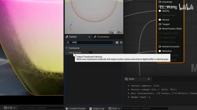 在材质中搜索velo找到并勾选Output Velocity以帮助UE能准确获取透明材质的深度信息;