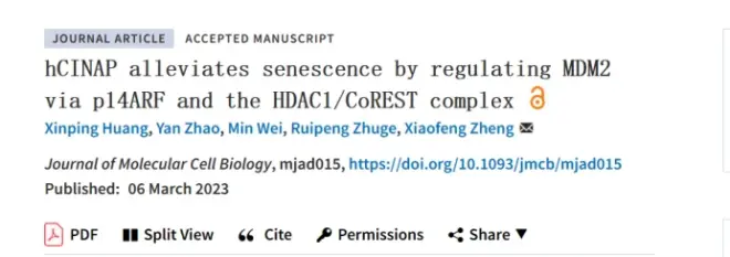 此前研究已证实,细胞衰老通过P53的活性加速衰老。在发现 hCINAP调节P53后,研究人员决定检查hCINAP是否通过这一途径影响衰老。