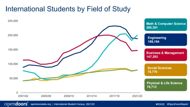 高薪资、未来发展的主流、留美机会等等标签下,无论是“身边即世界”的体感,还是具体的数值都表明,STEM是大热方向。根据美国国际教育学会曾发布的《2022美国门户开放报告》显示,54%的国际生申请了STEM方向的课程。