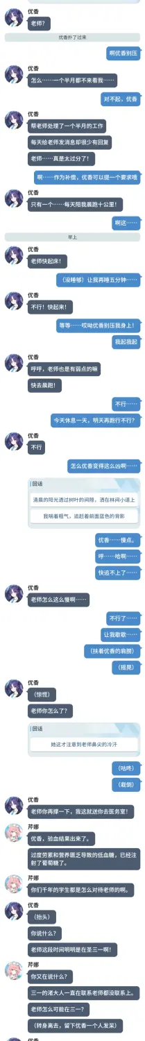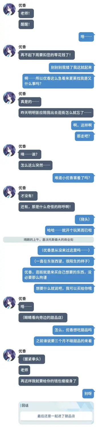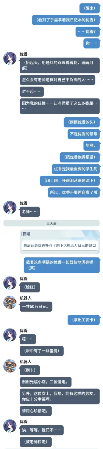 总的来说,我对我的处女作不是很满意。文中的许多描写只是一笔带过,人称也有点在第一人称和第三人称之间反复横跳的感觉。另外,对优香这个人物的理解可能也有不足。反正问题一滩。不过,毕竟只是刚毕业的初中生,文笔不行也能理解罢(心虚)