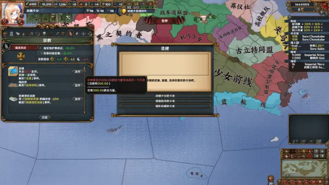 接下来是舰娘们。目前舰娘文化有三个国家,战舰少女,碧蓝航线,舰队收藏。她们信仰海洋共识。海洋共识使用圣公宗机制,有四个效果:抽卡,强化殖民,强化海军和基建,强化陆军。这里仅展示抽卡。