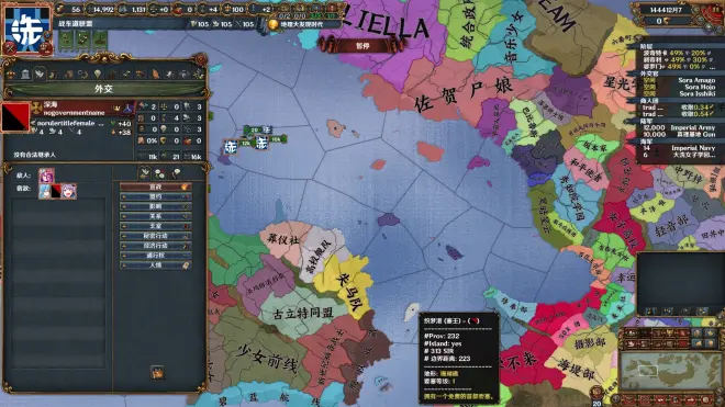 目前舰娘的玩法主要是建立强大的海军与殖民扩张。四国距离新大陆十分近,左边是“美洲”,下面是“澳洲”。