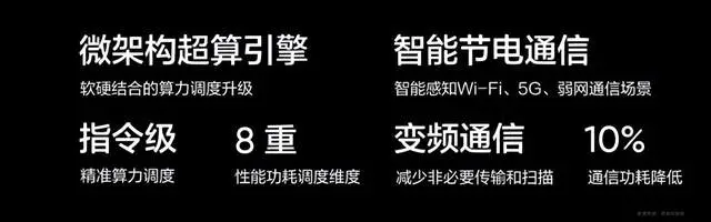 而AI智慧节电引擎则是底层算力资源调度的升级,通过超算平台算力模型微架构算力加速,可以实现指令级精准算力调度,降低功耗,同时还采用智能节电方案实现智能通信待机,AI智能感知Wi-Fi、5G、弱网等场景的通信需求,以变频通信减少不必要的传输通道以及搜索扫描动作,据悉可以让通信待机功耗降低10%。