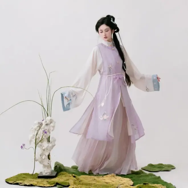 宽袖褙子是含天丝成分的料子,门襟处是不对称的花花绣花,袖口处也有花花绣花,还拼接啦薄纱面料,仙气又唯美。裙子是改良三裥裙,裙身上是白色的花枝印花,渐变紫色拼接米色面料,飘逸。
