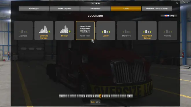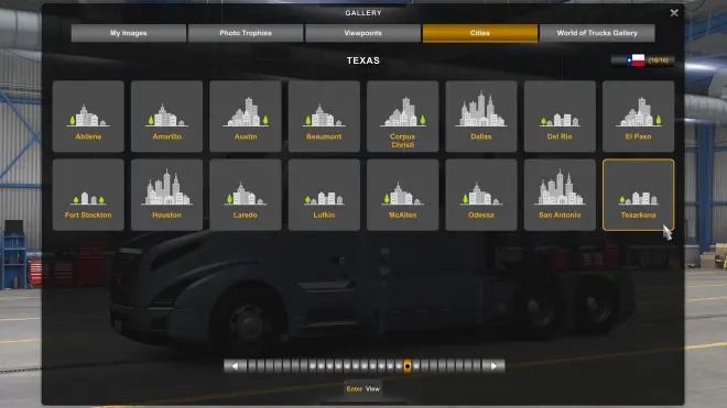 As you journey and discover the many cities of American Truck Simulator, you'll be able to collect them under the new 'Cities' tab. Once unlocked, you'll be able to view which cities you have visited, as well as watch and replay any of the city intro cutscenes; which are normally only seen when you first start your first HQ there.