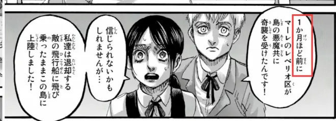 其实在timeskip之后一直用倒序插叙的手法,事件的时间概念其实很模糊,只知道是一年前、两年前这样的年份,具体到月份都很困难,但是谏山唯独有两个时间点给出了十分清晰的月份,一个是地鸣前十个月,一个是地鸣前一个月。