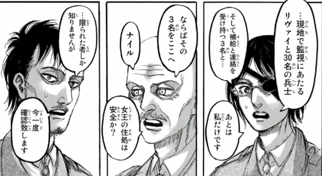 宪兵团是首先激烈反对的,认为吉克不可信,然后韩吉读到了吉克的方案——说白了其实就是艾伦1年前的猜想:始祖巨人和王血巨人。
