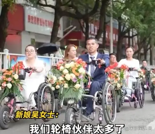 整个婚礼的亮点在于迎送亲的队伍,由52辆轮椅车和鲜花组成,象征着他们坚韧的爱情和残疾人群体的团结。