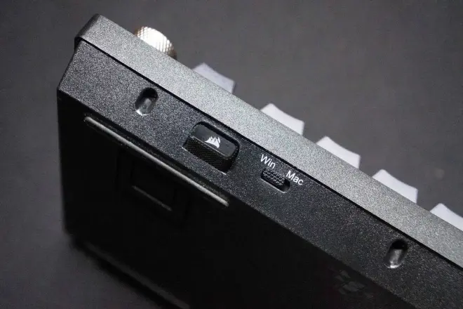 美商海盗船K65 PLUS将接口、模式切换键和电源键设计在了前方的位置,分别位于左右两侧。左侧是供电接口和三种连接方式的切换键,供电接口采用了主流的Type-C接口。