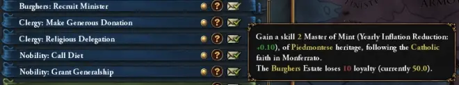 获得一个2级的铸币专家(-0.1通胀),皮埃蒙特文化,信仰天主教