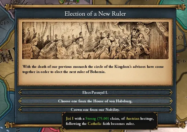 您始终可以选择从您的贵族中选出一位成为新的统治者。此外,如果你与一个不独立的国家接壤,拥有贵族(或其在达摩阶层中的等价物)阶层,是君主制,没有与你交战并且不处于摄政状态,那么你可以选择有上述情况国家之一的同王朝贵族作为你的新统治者。然而,这个特定的统治者是唯一一个上台前看不到其属性数据的统治者。