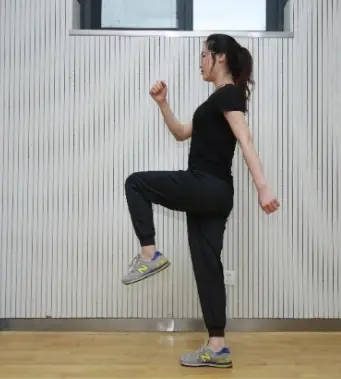 训练要点:双脚站立与肩同宽,左腿屈膝高抬腿,膝盖高过胯骨,然后放下,交替右腿高抬腿然后放下,配合双上肢摆臂,注意不要急于求快,保证平衡是首要,左右交替进行。