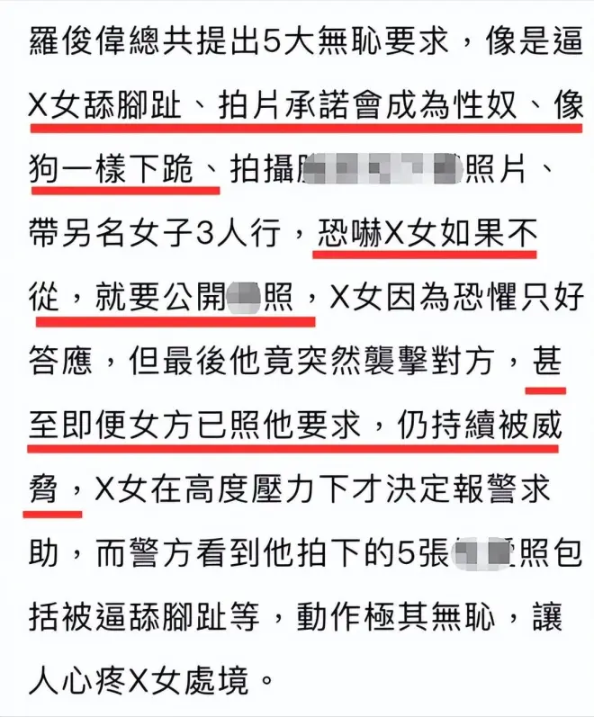 万般无奈下,她选择求助警察。根据她的描述,在这个过程中,她经历了为罗俊伟舔脚趾、被虐时要做出享受的表情等。