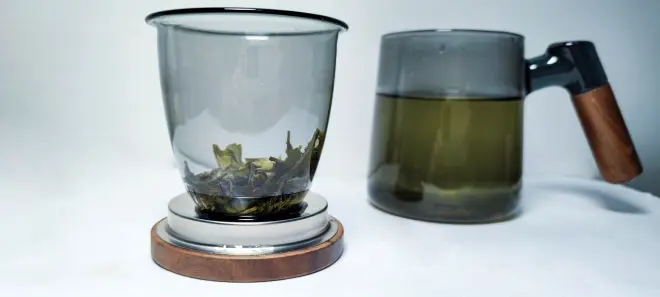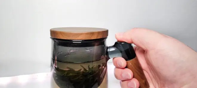 青山隐木柄玻璃泡茶杯选用的青色灰玻璃,提升茶杯质感的同时,还可以使得杯内茶汤颜色清晰可见。
