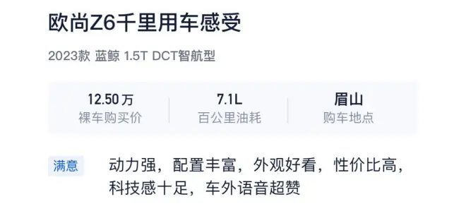 “对欧尚Z6iDD我最满意的就是它的外观颜值,非常好看大气的,空间也是很宽敞,价格配置做工确实是没得挑。今天刚到店提车回家,纯电跑起来很轻盈舒适,各方面都很满意。”