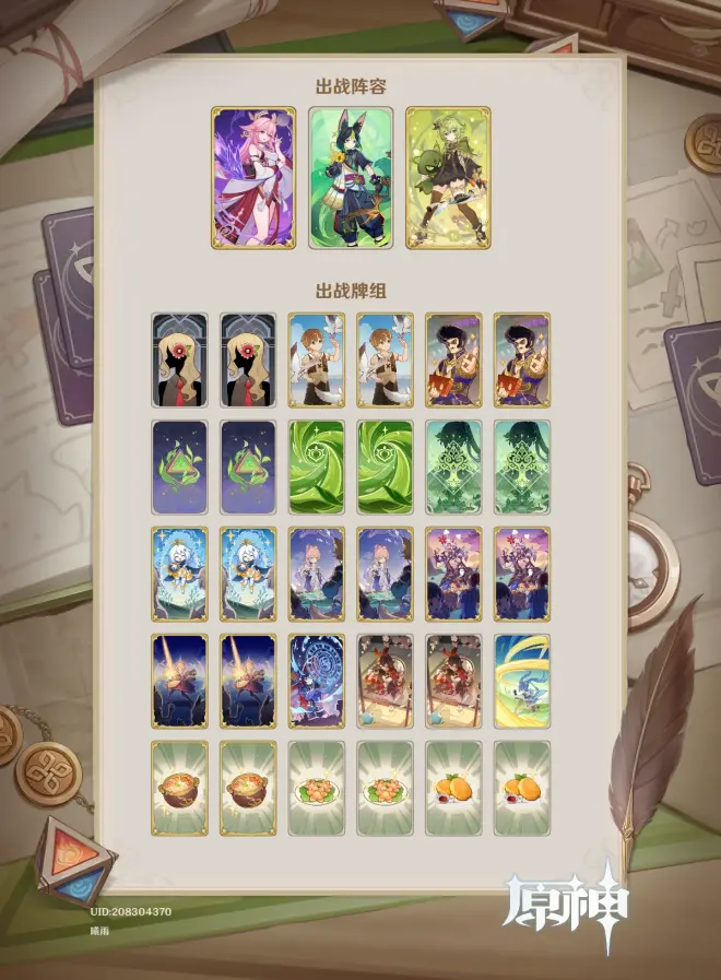 实际上,八重激化这个队没有特别吃骰子;它只有第一回合比较吃骰子,第二回合和第三回合,由于提纳里和八重都可以平A,所以其实并没有特别过分的骰子要求。但是为什么我们要携带三张调和牌?这是从两方面考虑的:其一,是调和牌的上手率。两张调和牌想要起手抓到可不容易,特别是你更想保留仙灵这种早下早赚的卡的时候。其二,是保证须弥共鸣的效率。调和卡不来,T1就难免烧牌;烧牌,须弥共鸣的收益就会下降(我们一再强调,须弥共鸣是构筑核心),你到时候能掏的东西就会变少。因此,三张调和牌是底线;携带四张也可以,看你个人的体验。