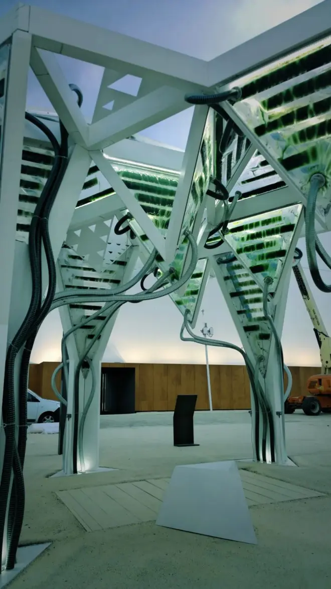 半透明绿色面板中的藻类与纳米流体结合,吸收太阳辐射并吸收高温,从而产生能量。三角形设计可以安装在任何类型的结构上。