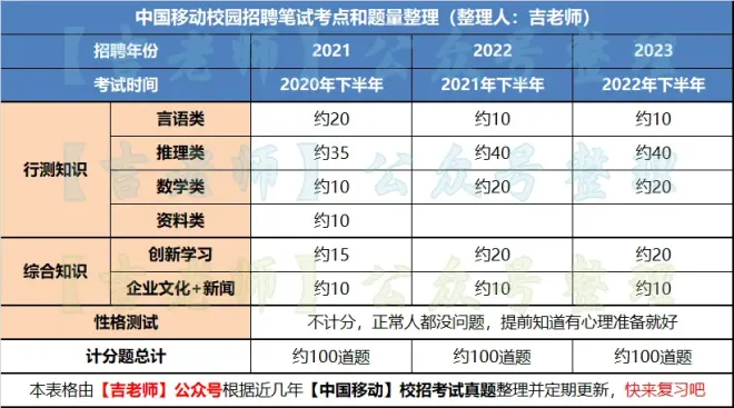从上表可以发现,中国移动的考点大类基本已经锁定为考行测知识+综合知识,其中综合知识考点基本不变,行测知识的考点每年都有做略微调整。【吉老师】公众号整理和预测中国移动后续校园招聘的考点和题量分布如下:
